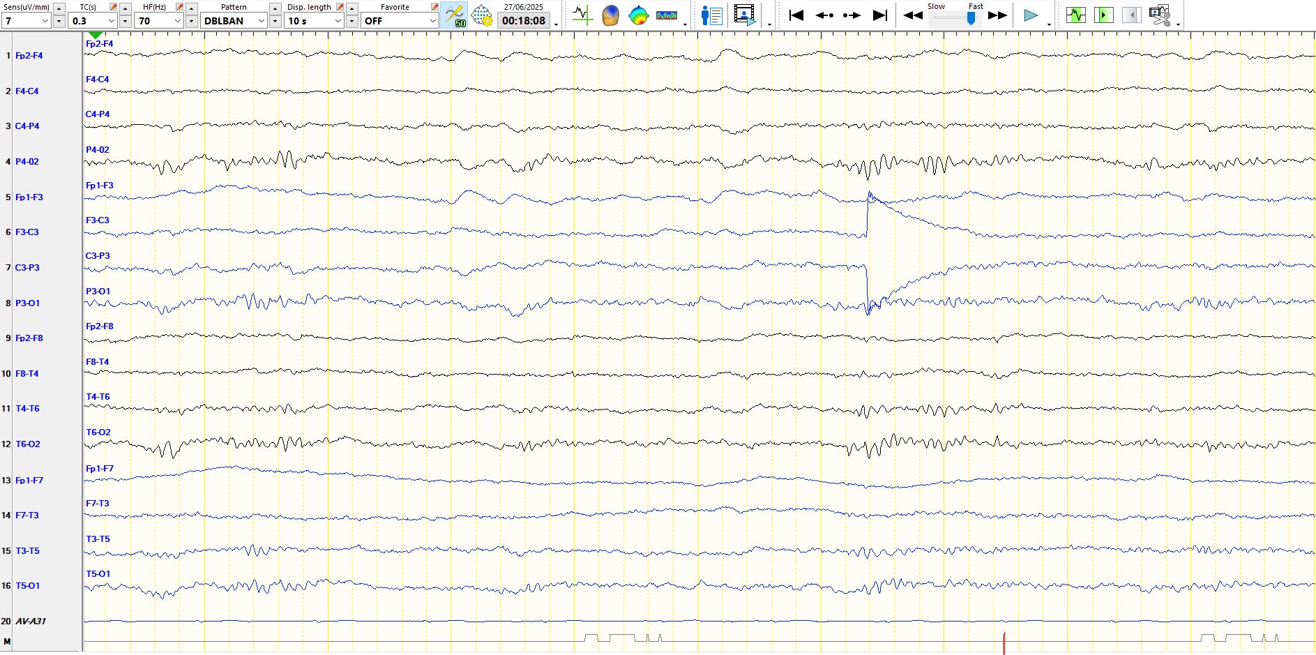 In the above image, the first wave has the same characteristics as the previous example. The second wave in the occipital regions is physiologically normal in sleep; the sharp wave is part of the background and there is a slower wave in both occipital regions. Hence, the spike-and-wave appearance is misleading, and you should ignore it anyway, given the low amplitude.