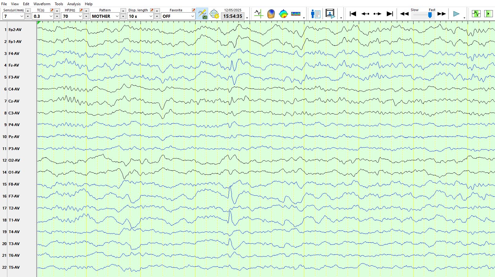 Notice the "pixelation" / multiphase component off the waveform when the notch filter is turned off in the image above. This simple example of turning on the notch filter illustrates the danger of turning on filters, with the result that artefacts are converted into "spikes", which in turn may lead one down the rabbit hole of an incorrect diagnosis of epilepsy, which, once made, may stick for decades. There are theta and delta waves at F7-T3-T5, most conspicuous in the first 2nd of the recording