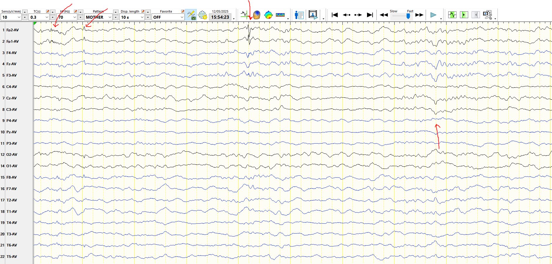Above: 2 sequential delta waves at F7-M1 (Left anterior, inferior temporal region, 1st two red lines) and a single sharp wave (arrowed) at F7-M1-F3-FP1 (Left anterior temporal/lateral frontal) in sleep.