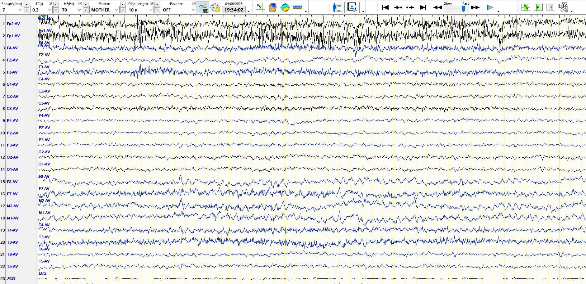 The above page is a representation of the previous page, here in the bipolar montage. You will be forgiven for thinking that the deflection at FP1-F7 is different to the background in channel 13 and that its second component is "steep". When confining your gaze to channel 14, you will readily appreciate that it is part of a rhythm.