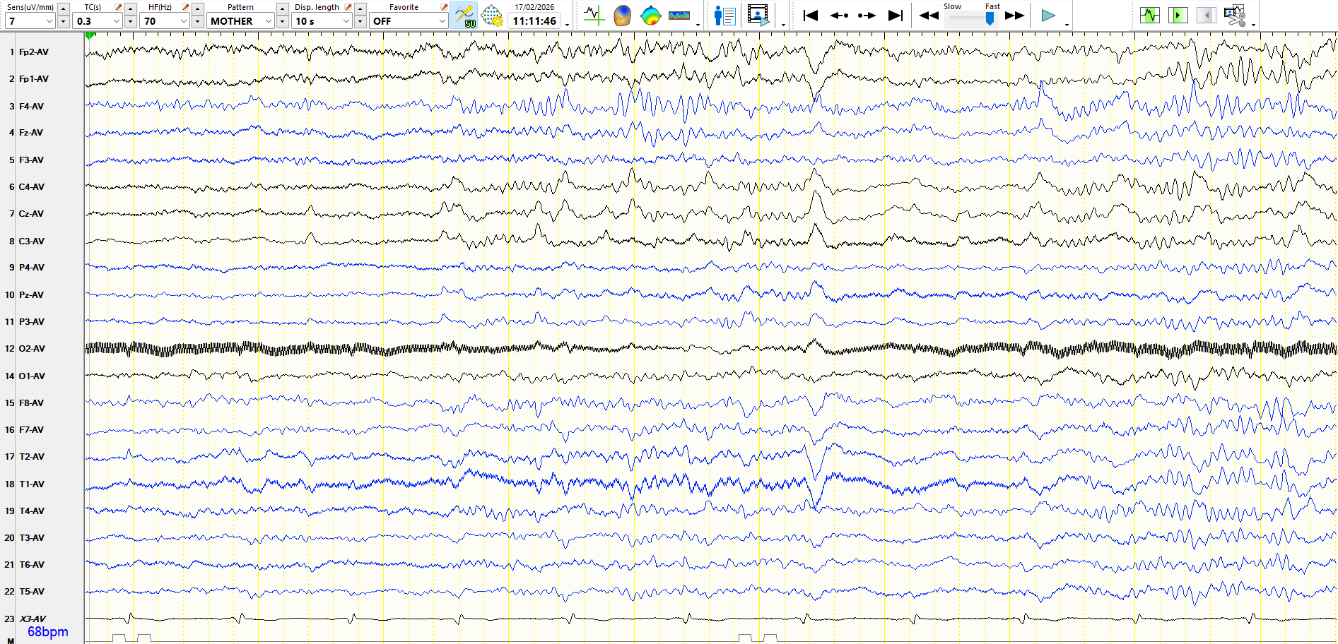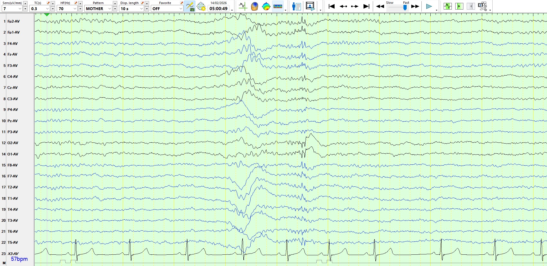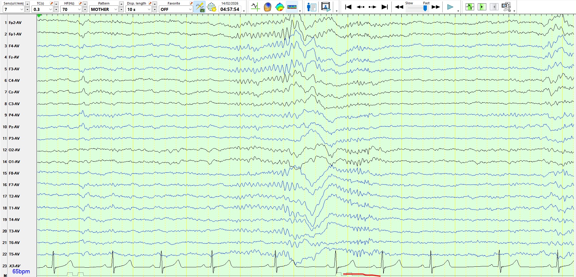 2. This is relevant, given the sharply contoured waves over the right frontal-central region. These have the morphology of vertex waves and appear exclusively during sleep. While some of these are symmetric in amplitude, some have a right-sided predominance and, on coronal montages, are primarily electro-negative over the right frontal-central region. Unsurprisingly, there is a vertex wave that is primarily electro-negative over the left front-central region on the 3rd and 4th images from the top. Asymmetries of vertex waves are common. These waves above, therefore, likely represent asymmetric vertex waves, rather than sharp waves; if you are in doubt, a conservative interpretation is once again prudent. Don't be fooled by your biases related to having viewed the MRI scan. Just for good measure, at the foot of this page, I have appended an EEG from a 20-odd-year-old patient with "POTS", who does not have epilepsy. The patient has a normal EEG, including these asymmetric V-waves.