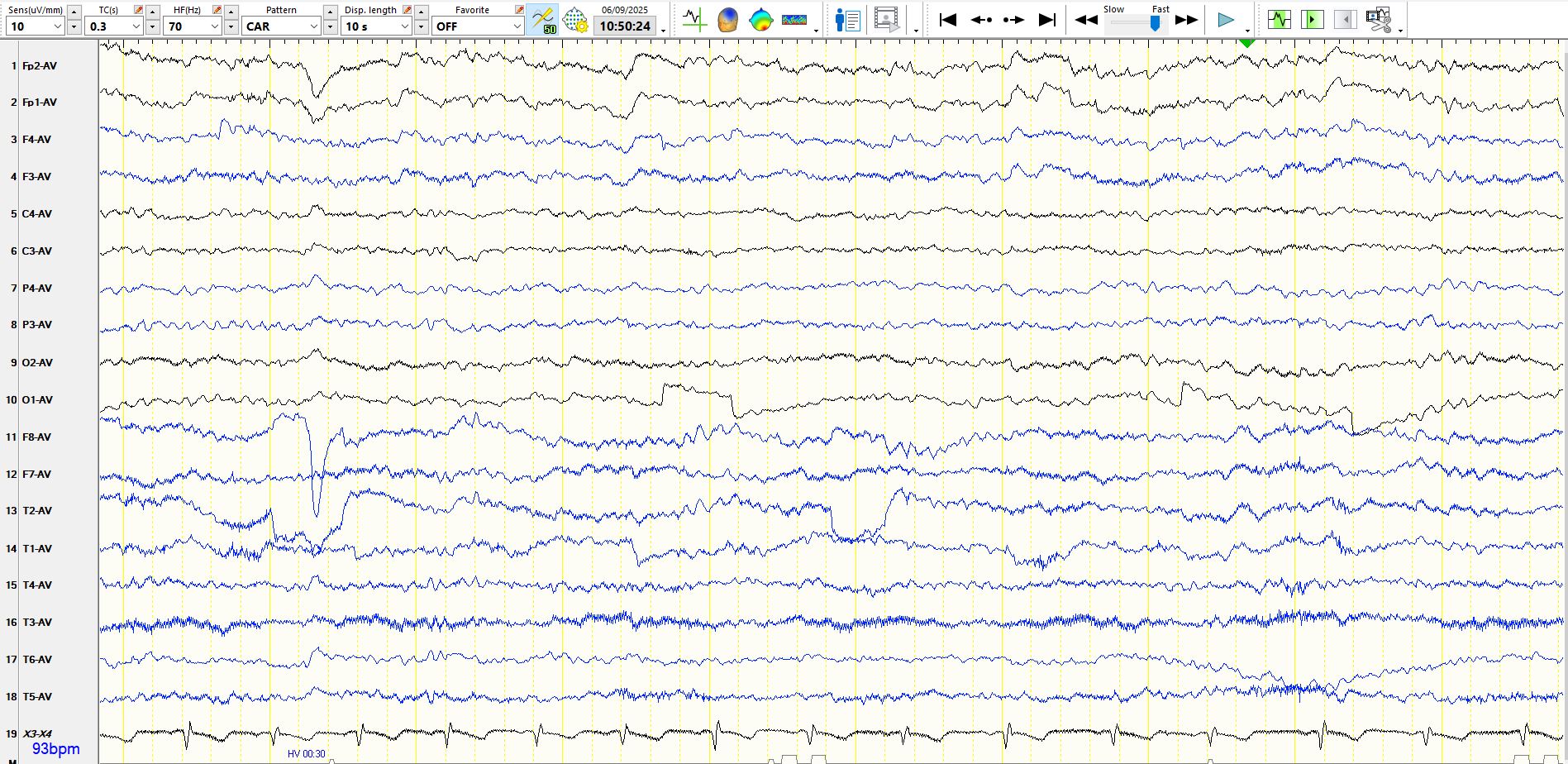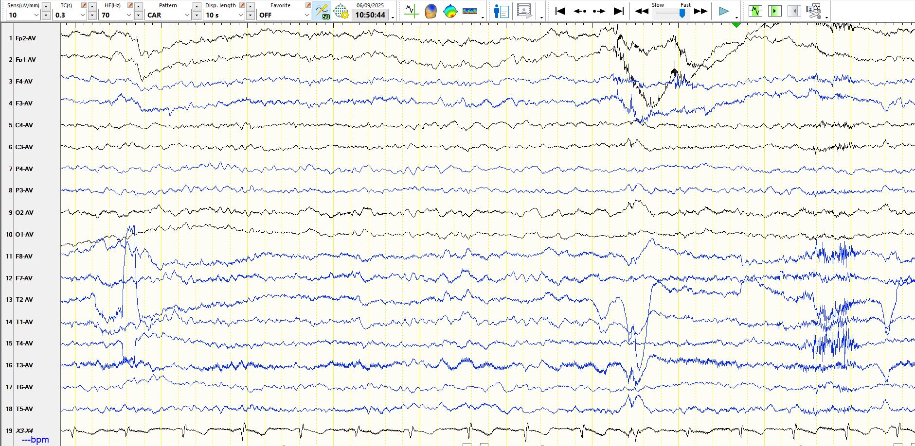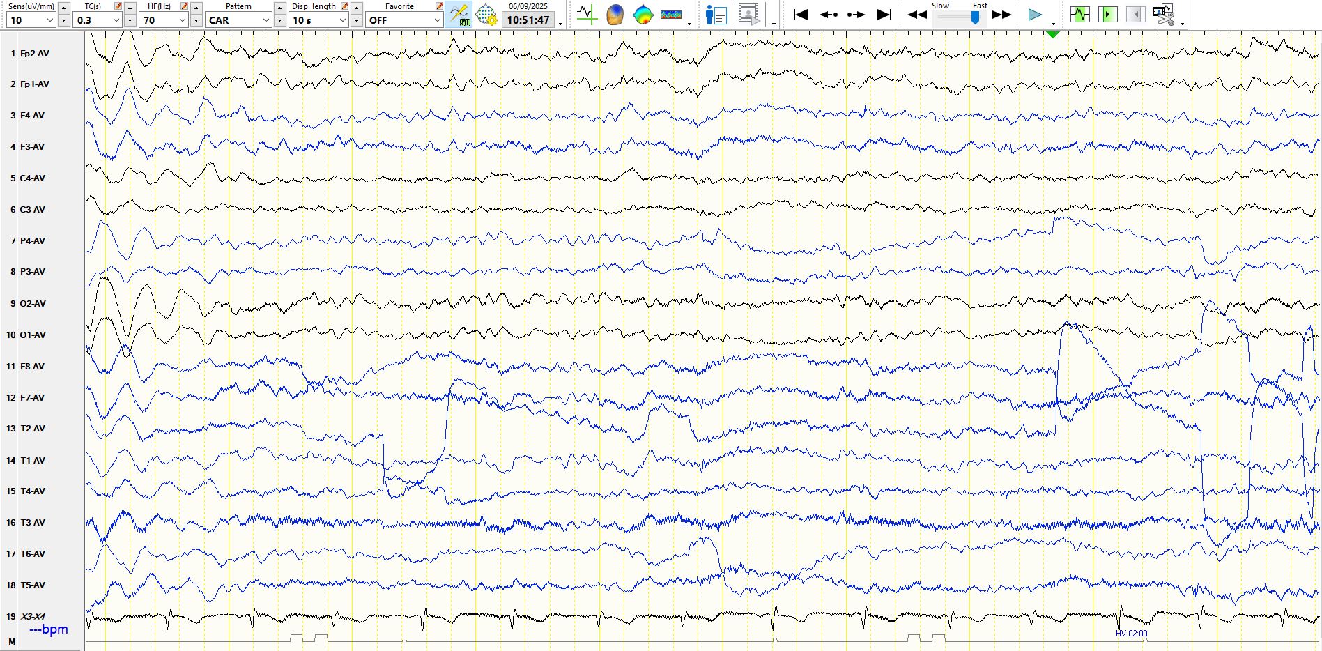 As you may have noticed, the above pages were recorded while the patient was hyperventilating. It is common to see intermittent bursts of delta waves and long runs of rhythmic delta waves during hyperventilation. If they are bilaterally synchronous and generalised, as they are above, they represent a normal phenomenon. The mechanism(s) for their appearance had been the subject of scientific hypotheses for longer than I have been on planet, but the dominant view over the past few decades has been that this relates to hypocarbia and cerebral vasoconstriction, with resultant cerebral hypoxia. Cerebral alkalosis may also have a role. The rhythmic slowing on EEG is sometimes associated with alterations in awareness and symptomatology, including automatisms. that resemble epileptic seizures, but the occurrence of these should not lead to the EEG phenomenon being reported as absence seizures. Hence, if the technologist tells you that the patient was unresponsive or unaware, don't fall into the trap of calling these absence seizures; doing so likely will result in unnecessary and potentially harmful treatment. It is worth saying that the slowing that one sees during hyperventilation resembles that seen on EEG when patients have cardiac arrest or arrhythmias or tachyarrhythmias.