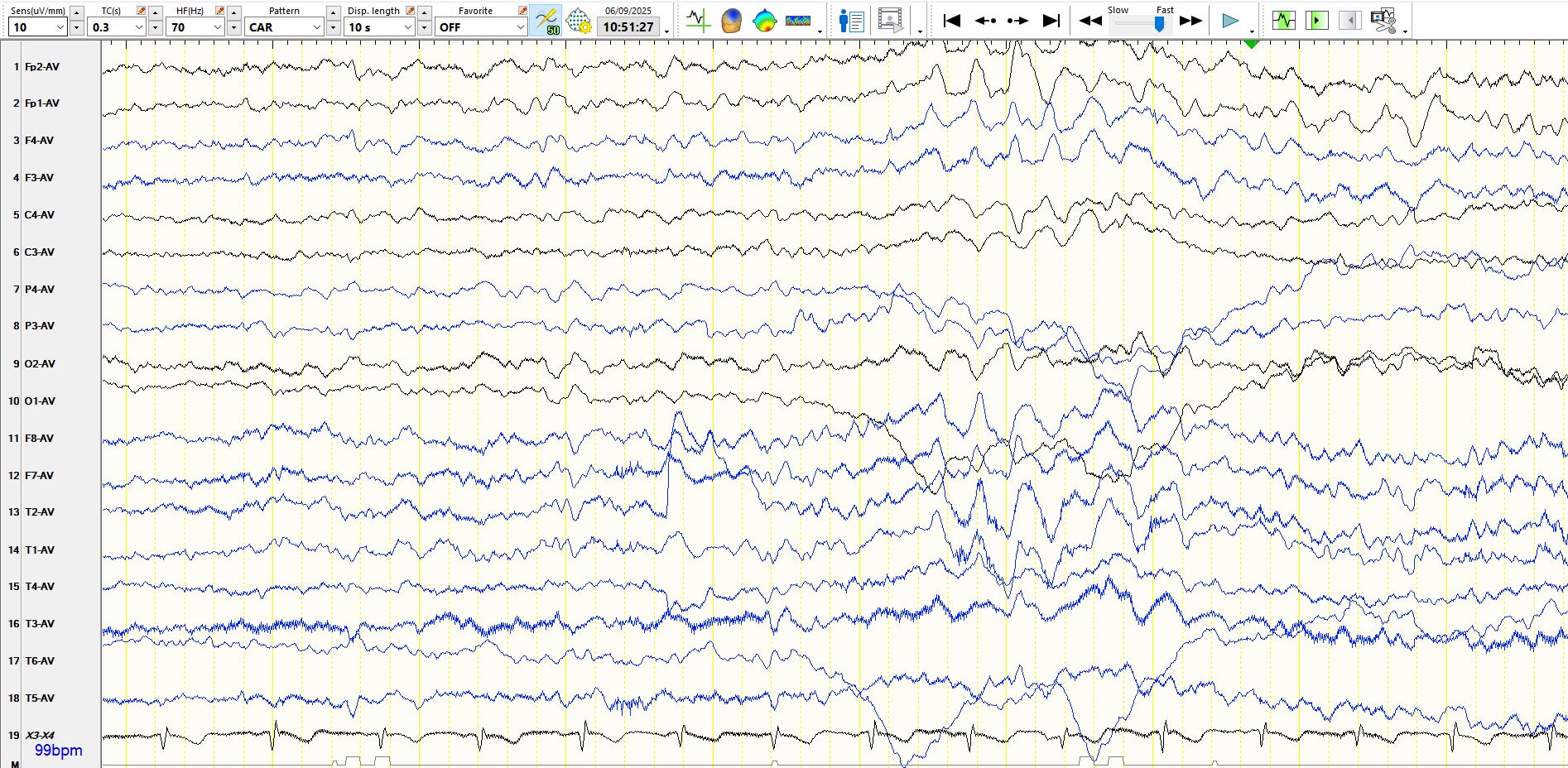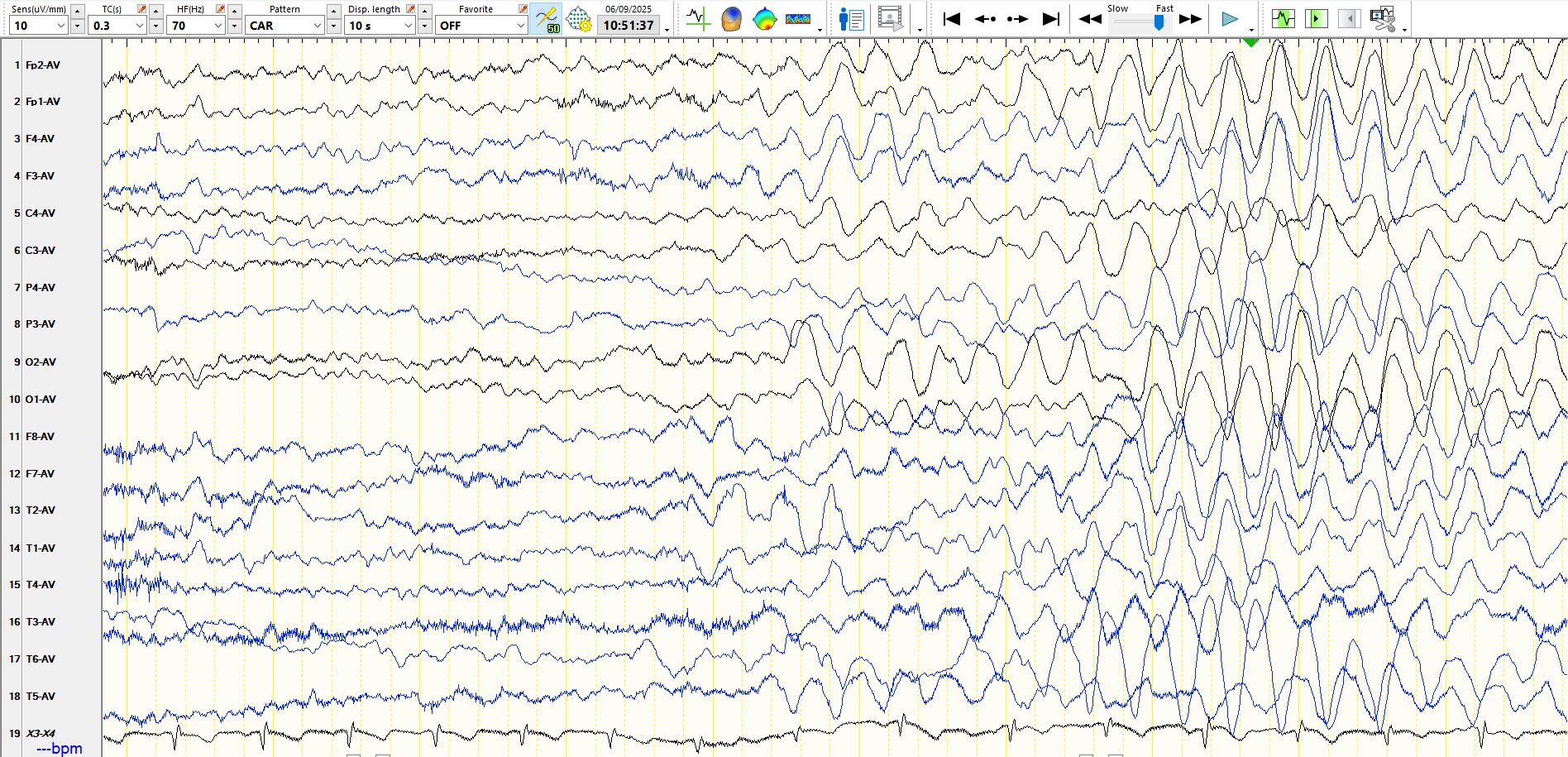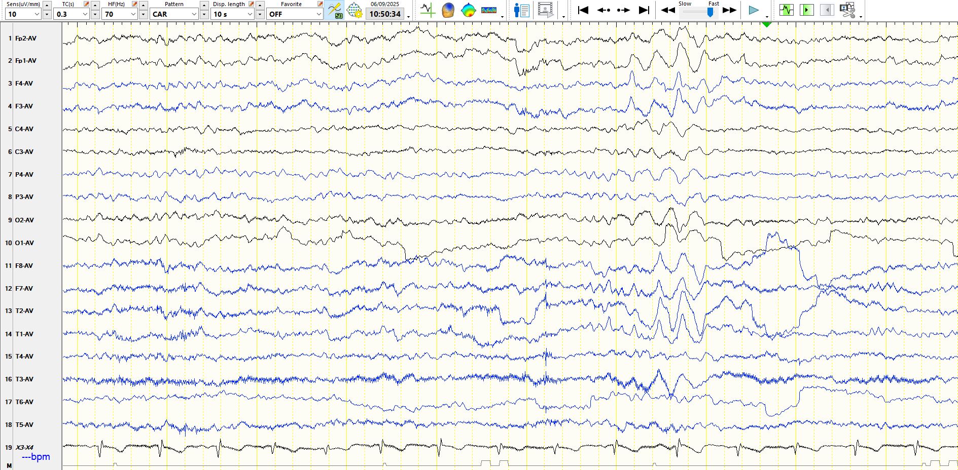 As you may have noticed, the above pages were recorded while the patient was hyperventilating. It is common to see intermittent bursts of delta waves and long runs of rhythmic delta waves during hyperventilation. If they are bilaterally synchronous and generalised, as they are above, they represent a normal phenomenon. The mechanism(s) for their appearance had been the subject of scientific hypotheses for longer than I have been on planet, but the dominant view over the past few decades has been that this relates to hypocarbia and cerebral vasoconstriction, with resultant cerebral hypoxia. Cerebral alkalosis may also have a role. The rhythmic slowing on EEG is sometimes associated with alterations in awareness and symptomatology, including automatisms. that resemble epileptic seizures, but the occurrence of these should not lead to the EEG phenomenon being reported as absence seizures. Hence, if the technologist tells you that the patient was unresponsive or unaware, don't fall into the trap of calling these absence seizures; doing so likely will result in unnecessary and potentially harmful treatment. It is worth saying that the slowing that one sees during hyperventilation resembles that seen on EEG when patients have cardiac arrest or arrhythmias or tachyarrhythmias.
