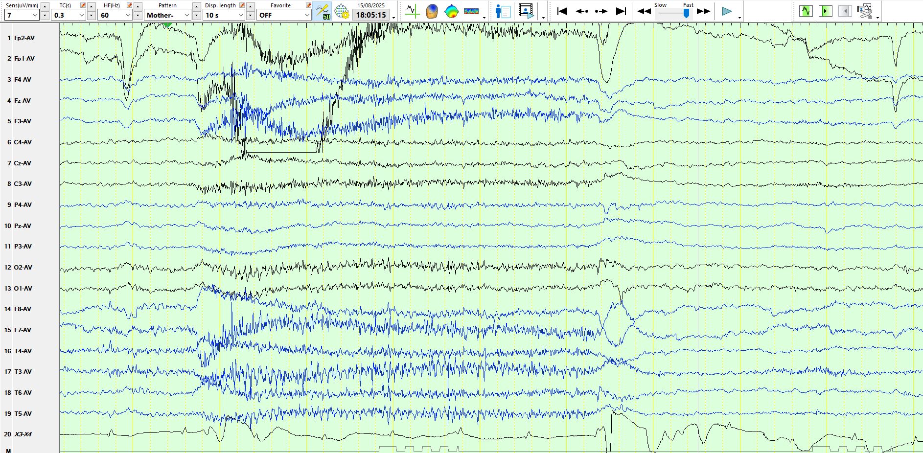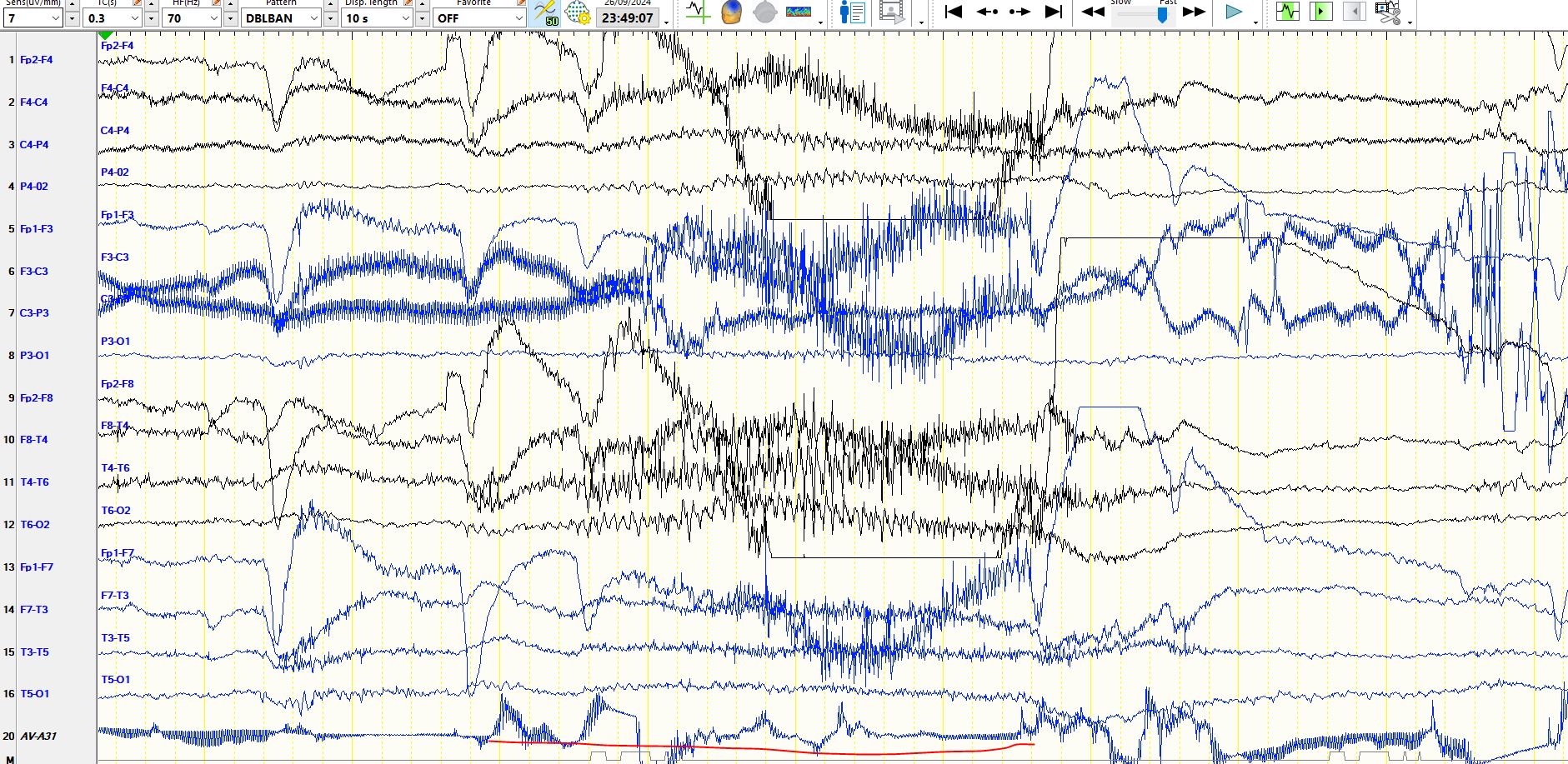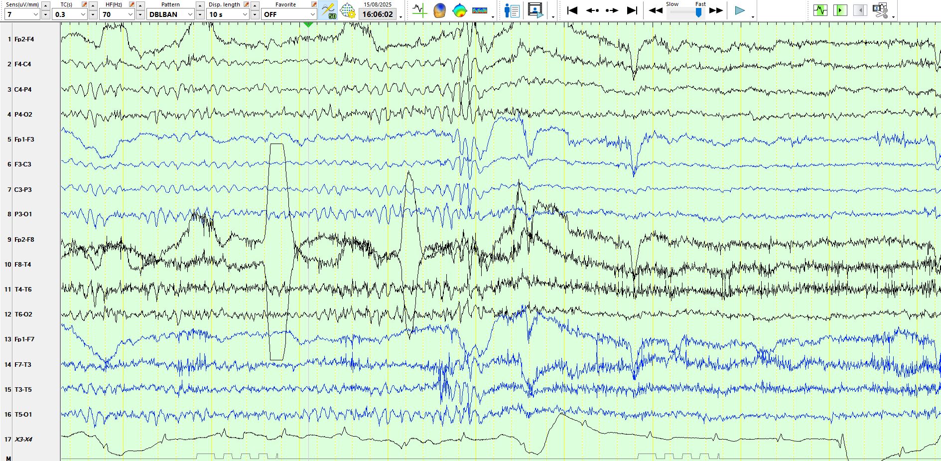 The other point of interest is the morphology of the repetitive spiking in response to eye-closure (figures 5-10, 13-1, 17); this resembles EMG artifact. One could easily mistake these discharges for EMG artifact and therefore miss important, at times prolonged discharges, some of which arguably represent electrographic seizures, such as in figures 5-8, 10, 16. I was sitting with the patient at the time of figure 5 and asked him whether he had felt anything; he reported with an emphatic "yes, like little seizures, I feel a bit dissociated". This makes the point that the distinction between a clinical and an electrographic seizure is often utterly arbitrary and context dependent.