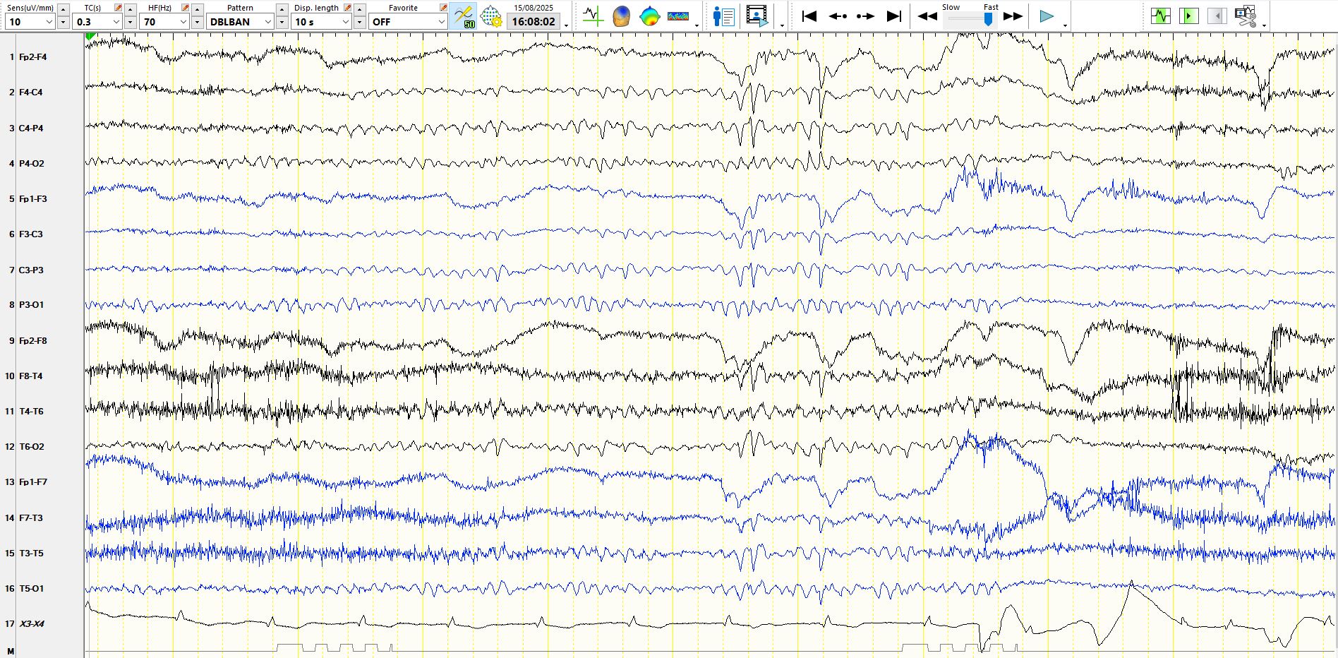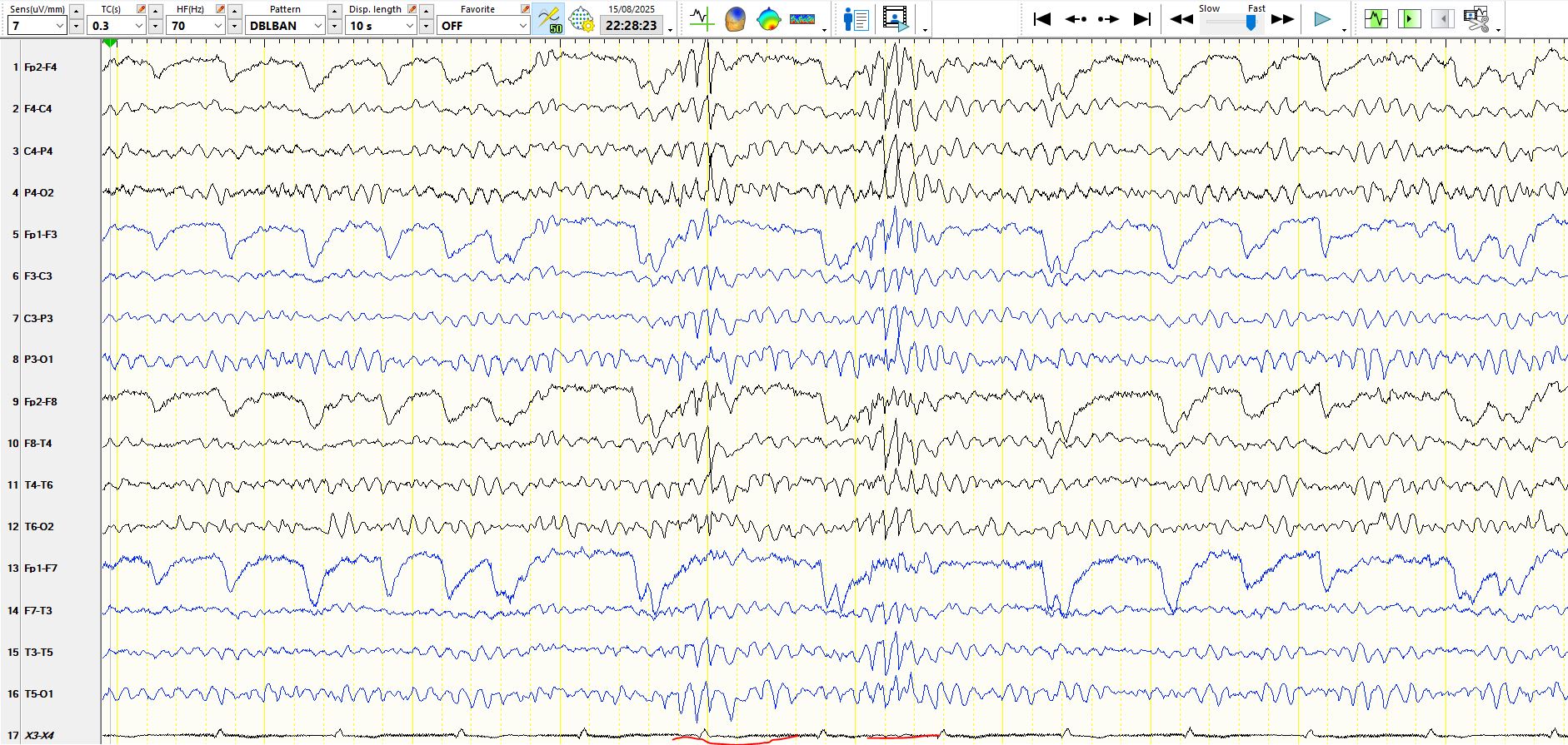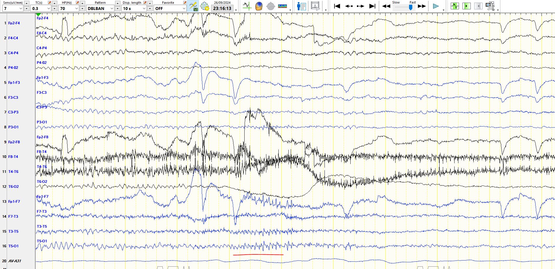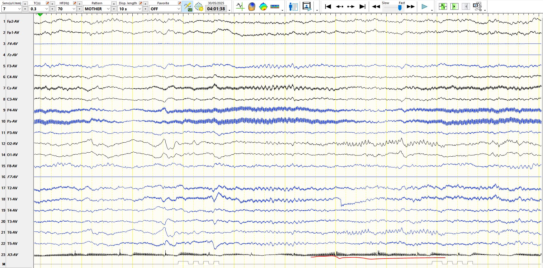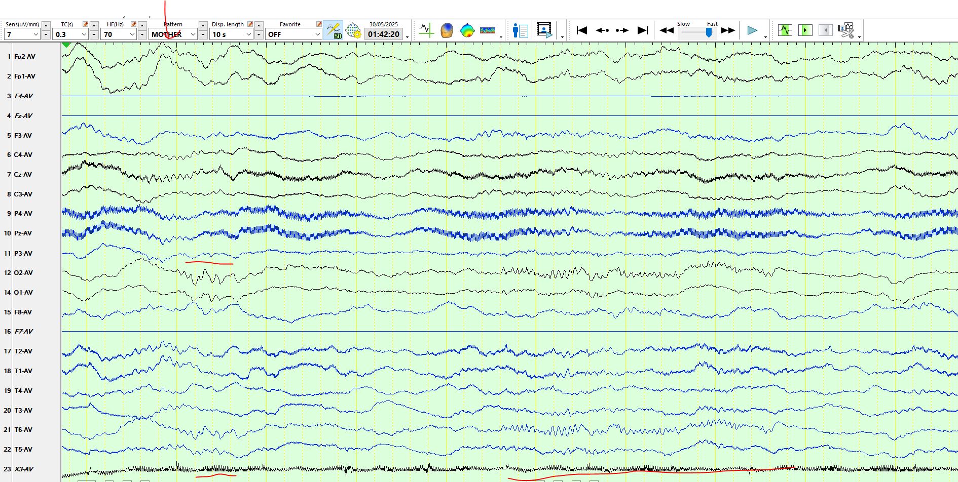 The final point is that bursts of generalised alpha frequencies may sometimes represent inter-ictal epileptiform discharges. A reminder, focal alpha frequencies may sometimes also represent epileptic seizures, as is the case in the image below from this case 17, born prem, given O2, blind, MRI reported as normal