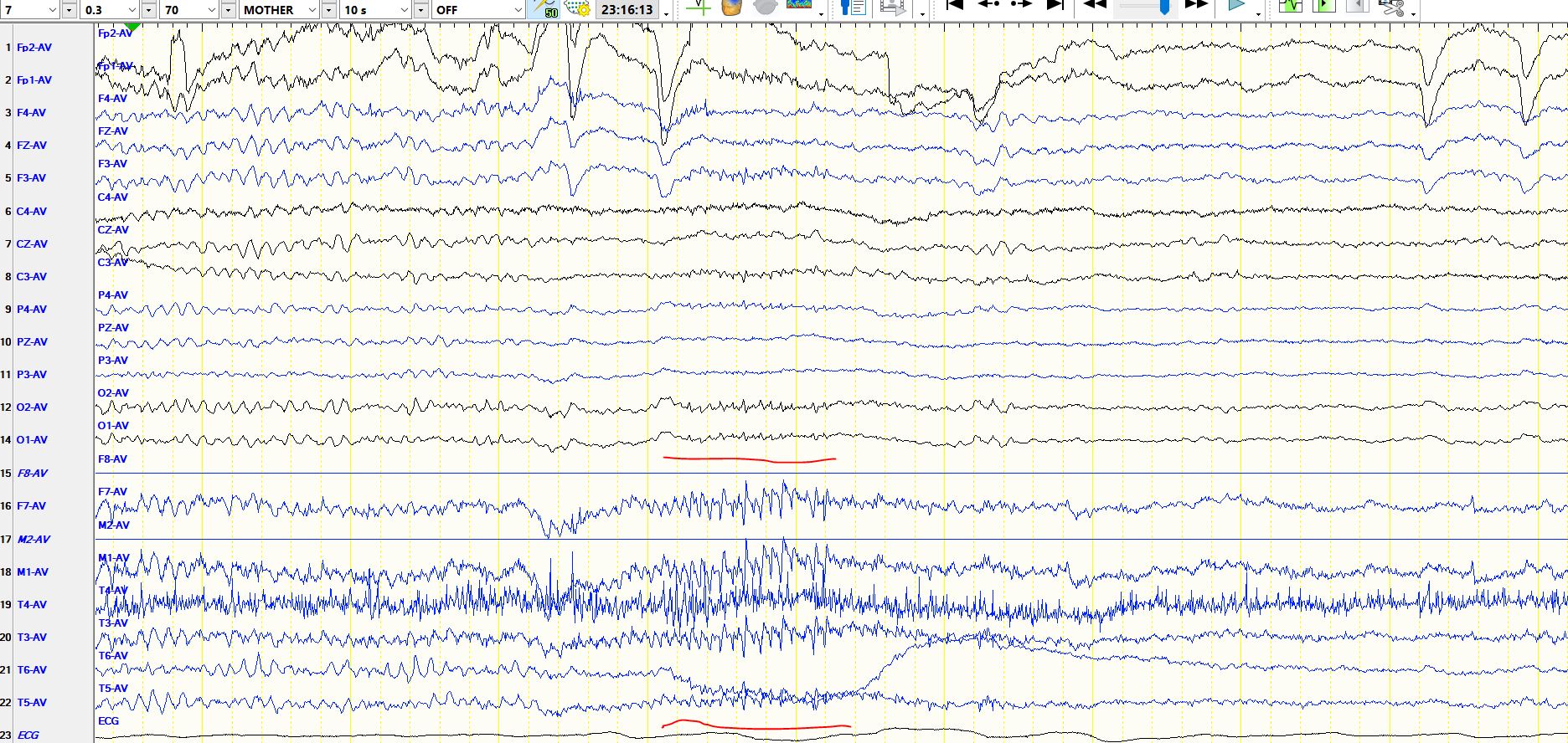The vertical red arrow above delineates sleep spindles, the first horizontal red line delineates sequential spikes at 02-T6 and the long horizontal line demonstrates a prolonged alpha frequency discharge at 02-T6, arguably representing an electrographic seizure lasting approximately three seconds.