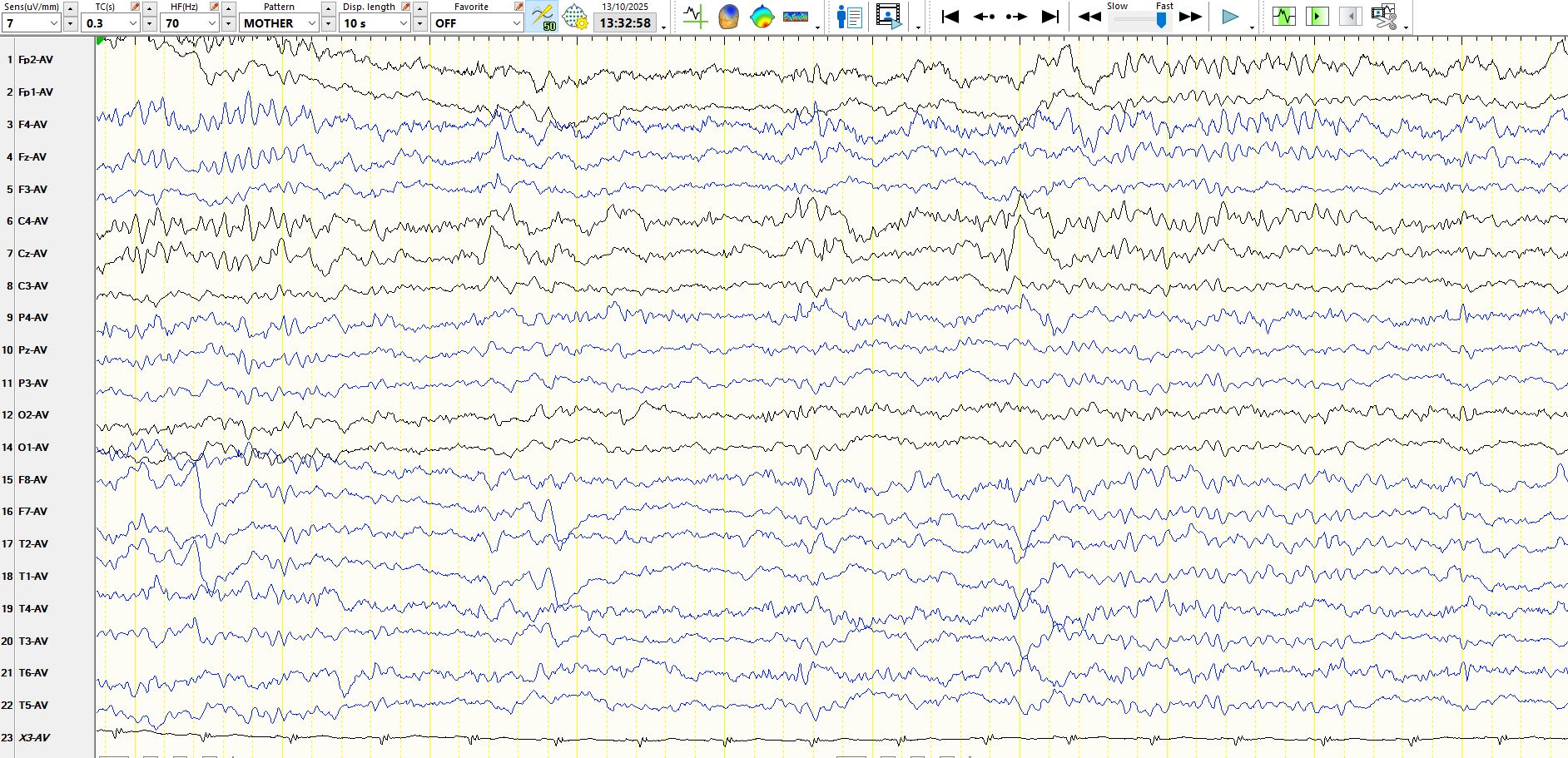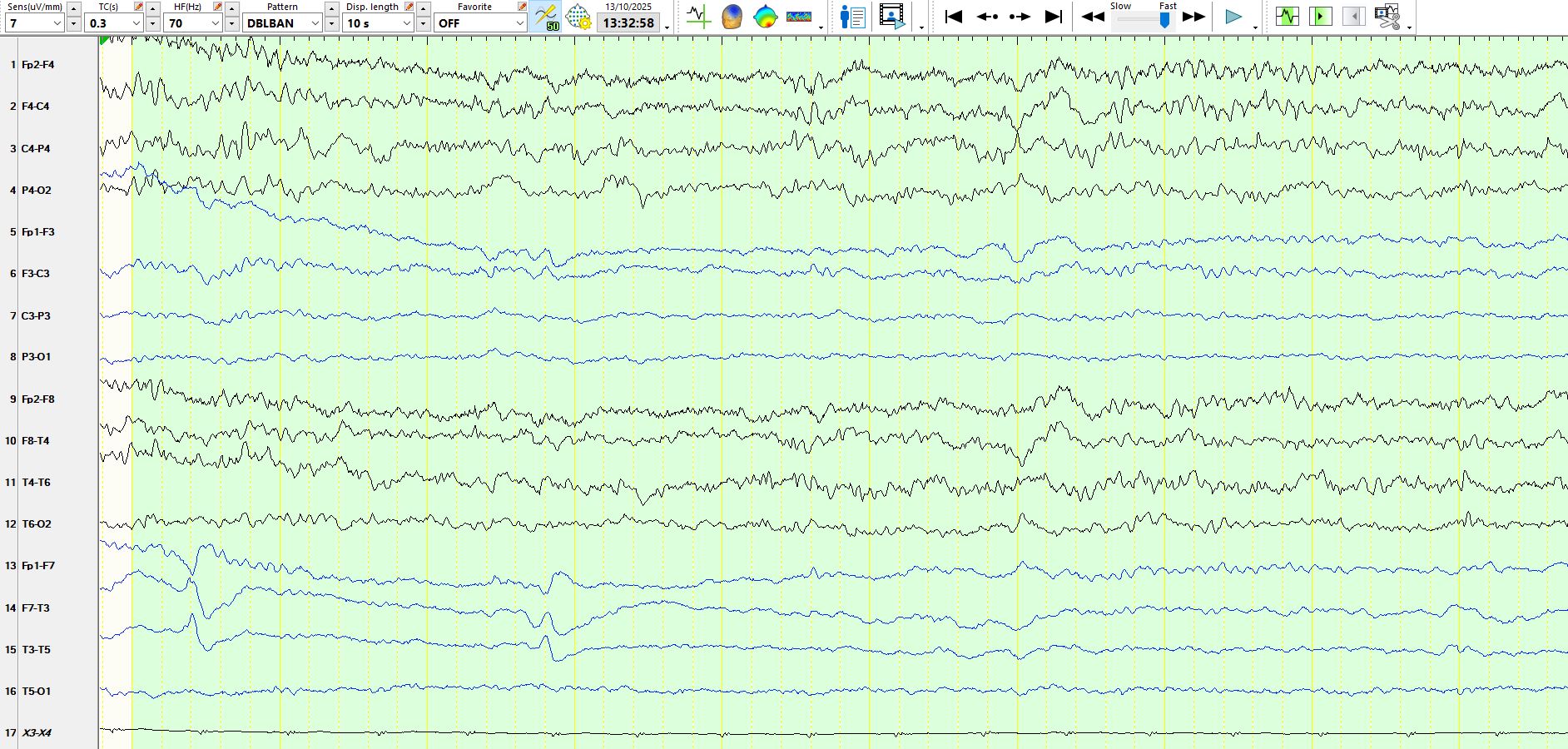 While there is an asymmetry of beta frequencies on the common average montage, especially over the central-parietal regions, the asymmetry is easily missed. The bipolar montage demonstrates suppression of normal rhythms over the left hemisphere; the suppression over the left hemisphere cannot be appreciated on the referential montage. The EEG has been performed on a patient who has previously had a left hemispherectomy.
