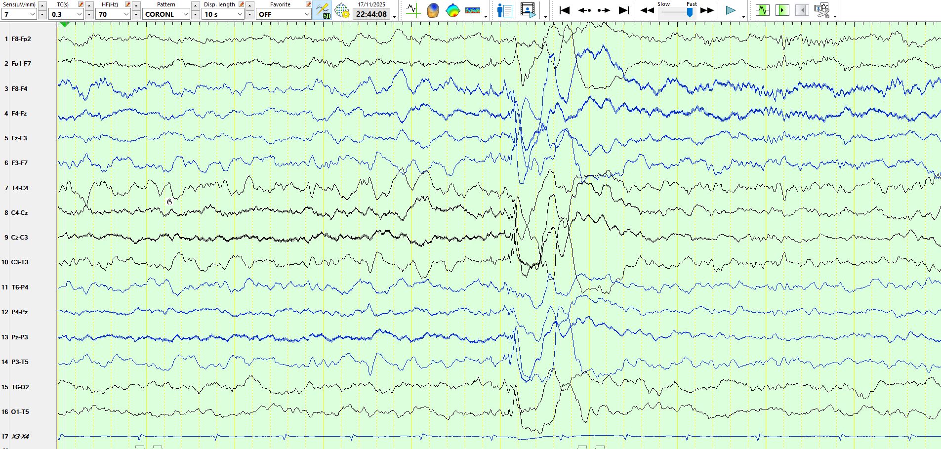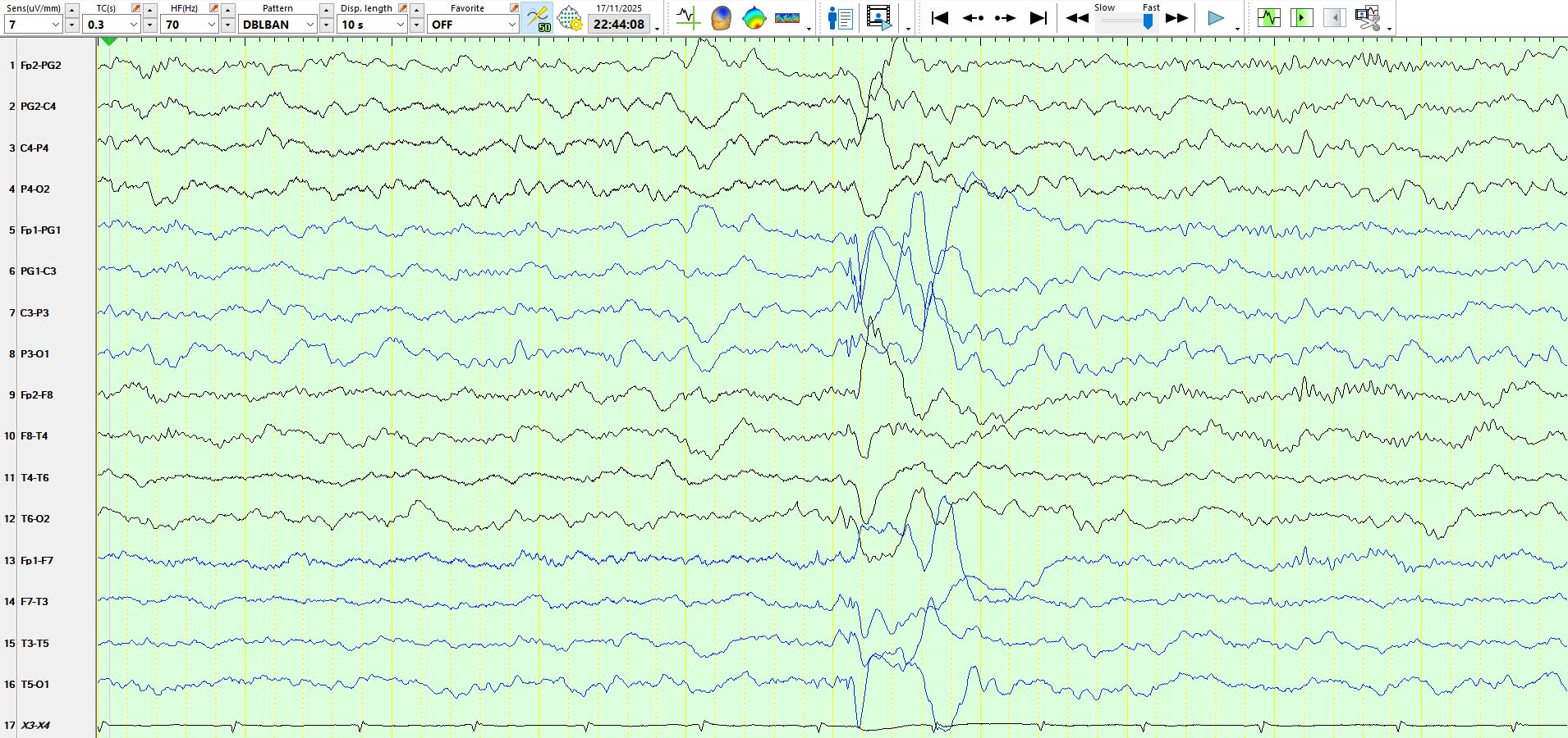 The patient had several such discharges in sleep. The above 3 pages represent the same 10 seconds via different montages. As Yogi Berra famously said, "You can observe a lot by just watching". In this instance, the waves that precede the spike-and-wave have the characteristic morphology, polarity, and distribution of 14- and 6-Hz positive bursts. Hence, this is a benign variant, and these discharges should not be interpreted as representing interictal epileptiform discharges.