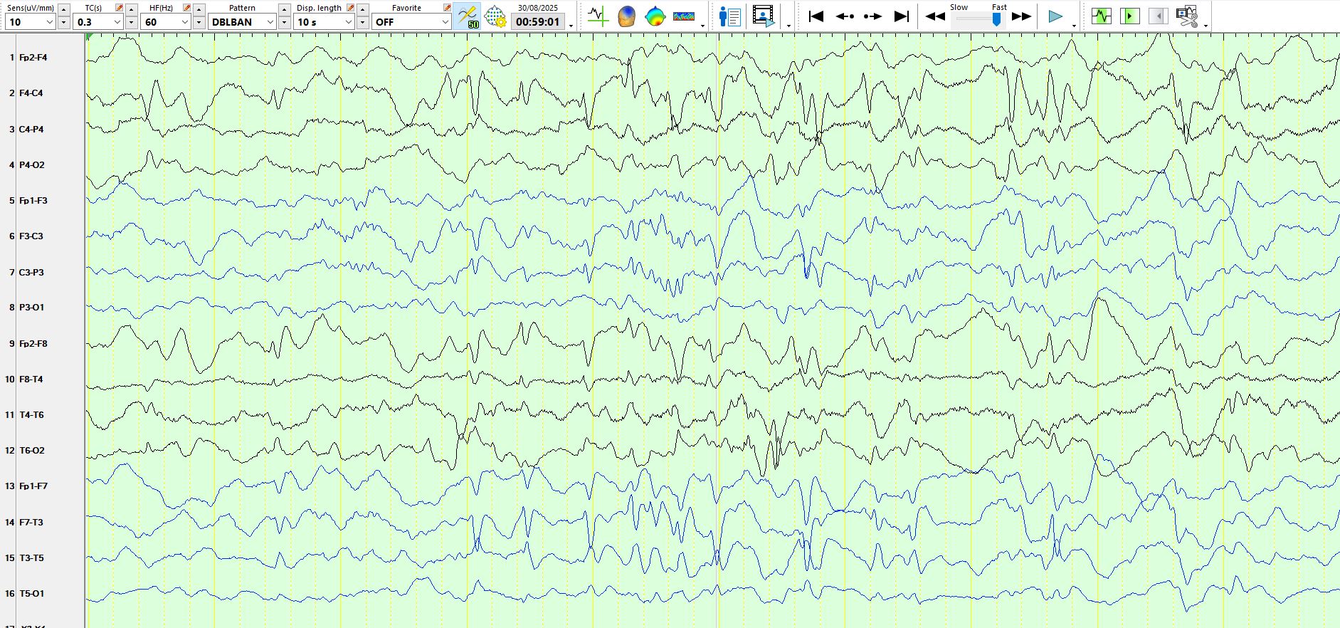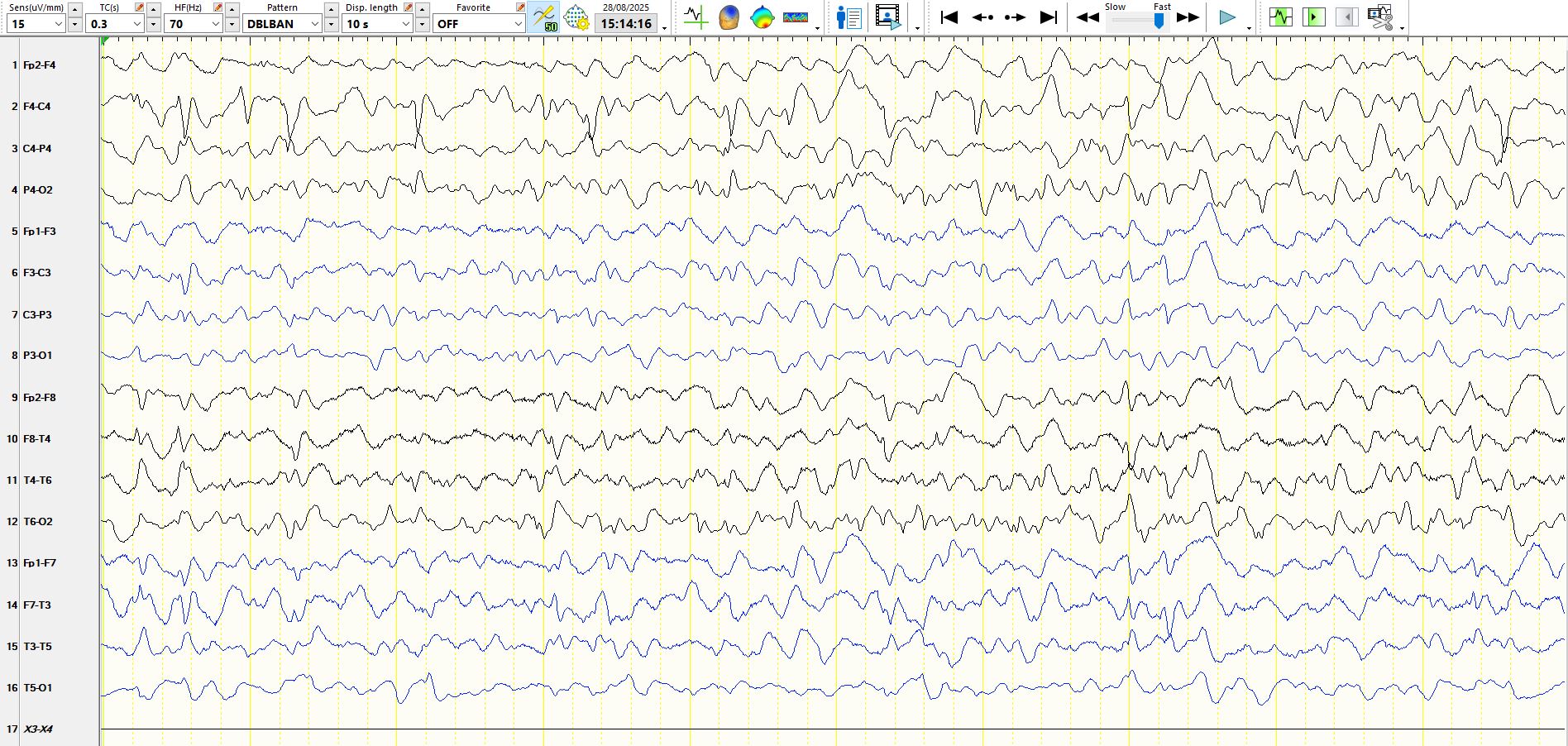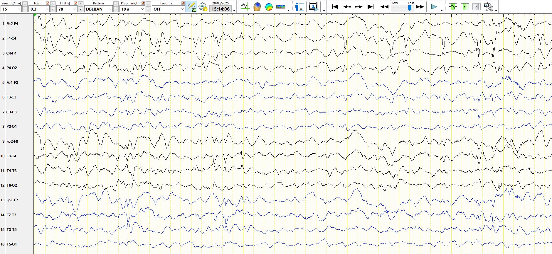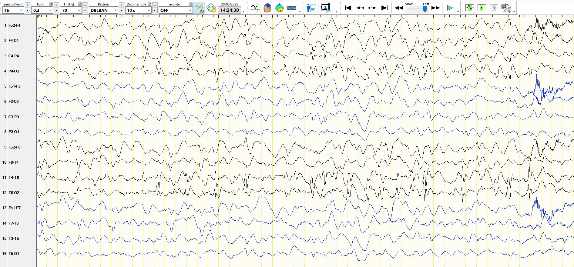 In the coronal T1 weighted image above, the body of the right hippocampus is atrophic, with reduced signal within the same hippocampus, predicting neuronal loss and spongiosis. in this example, the hippocampal atrophy likely is a consequence of the seizure disorder, rather than the cause. Furthermore, the symptomatology of the seizures is primarily of motor seizures, typically tonic-clonic with some motor asymmetries implicating the right hemisphere. However, it is the absence of a history of temporal lobe seizures that is equally important. Then there is the interictal EEG recording: