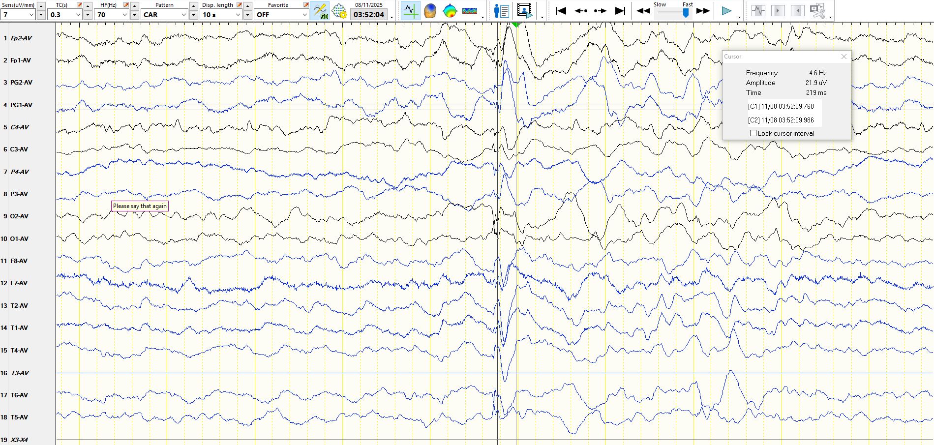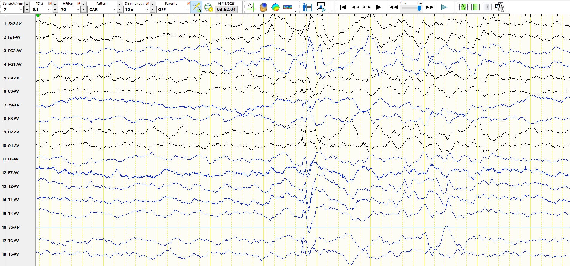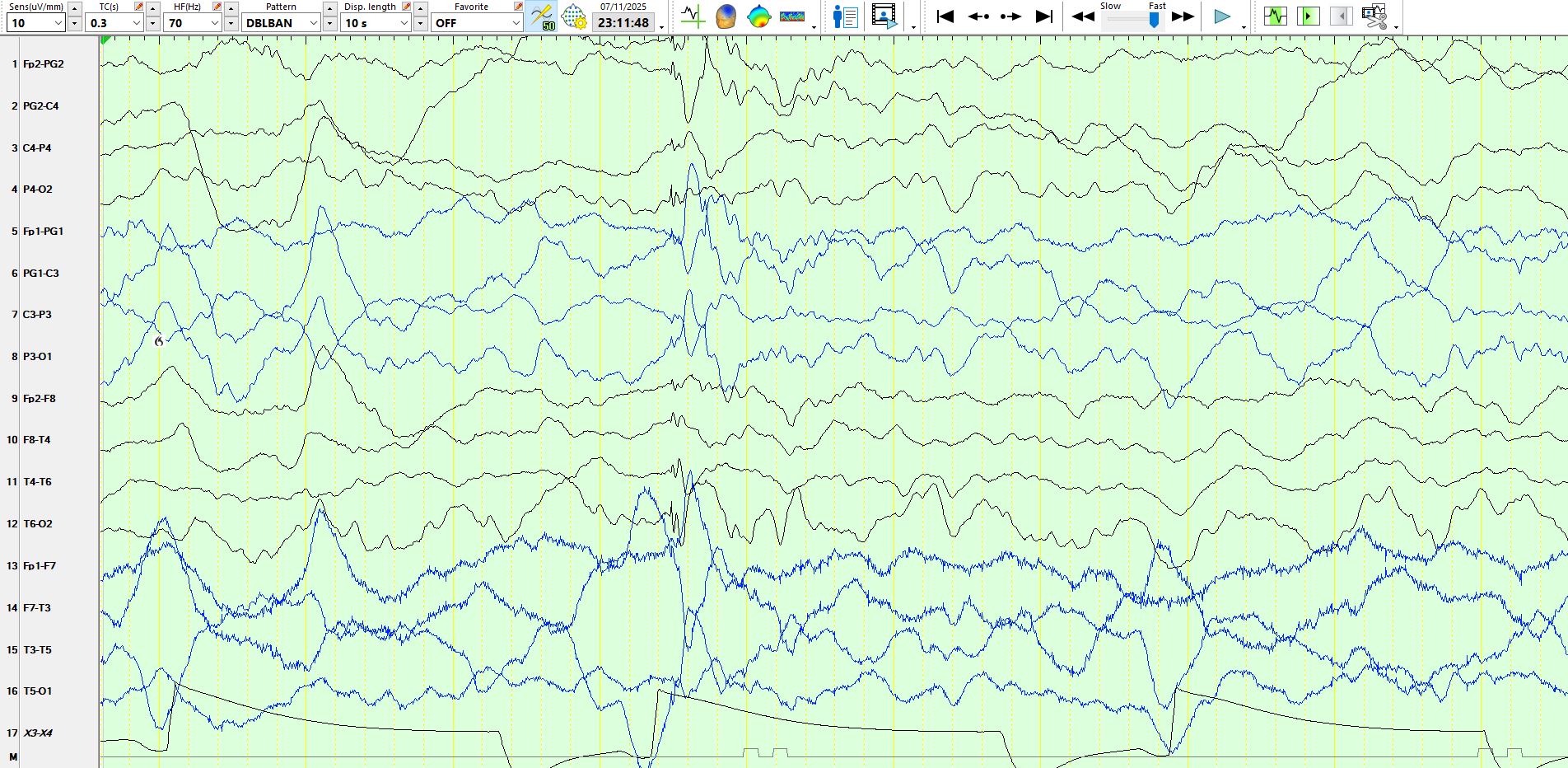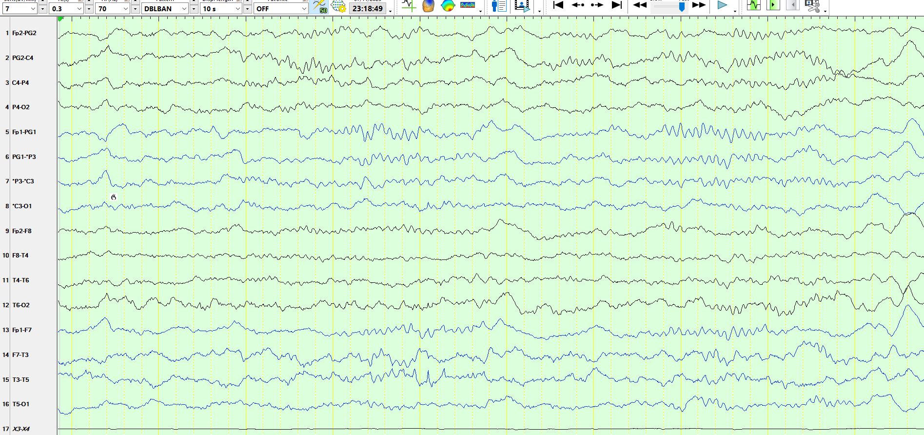 PPS: The two pages demonstrating the same epoch on bipolar montage are shown because it was clear to me, while looking at the top page, that there was a transposition of C3 and P3. Correction of this on the second page elegantly shows the vertex wave on the left-hand side of the page.