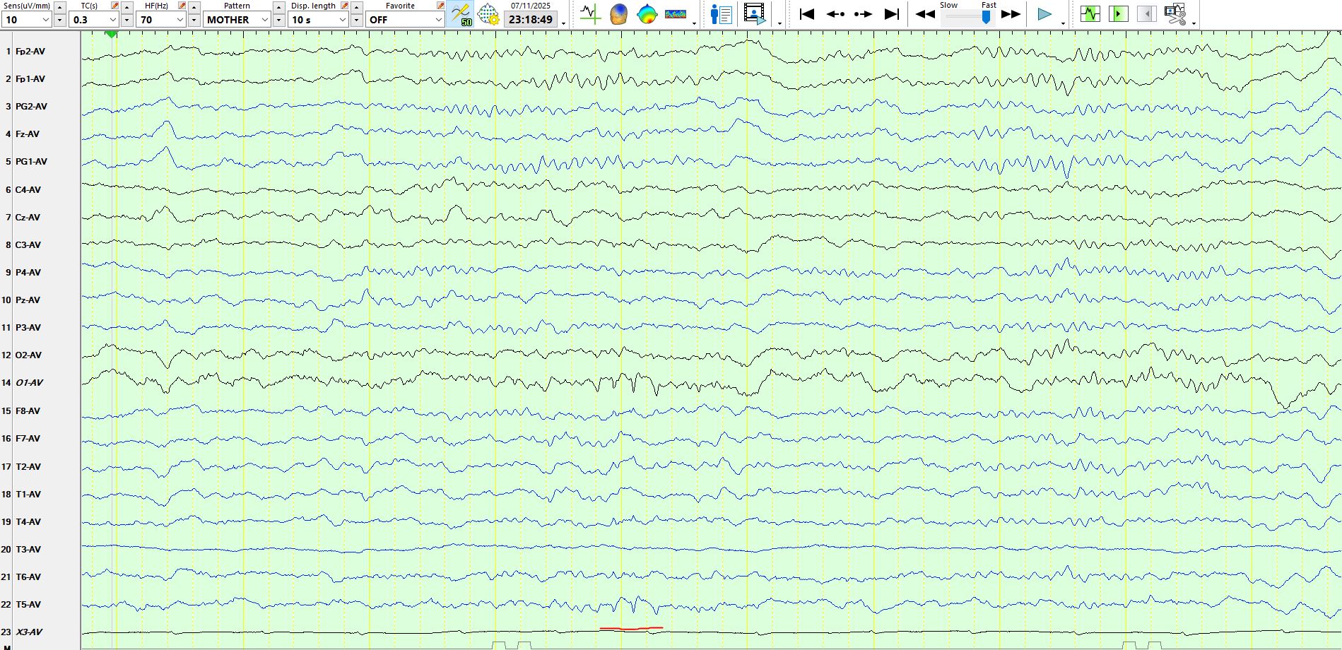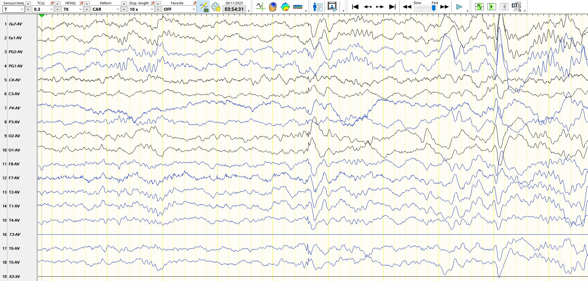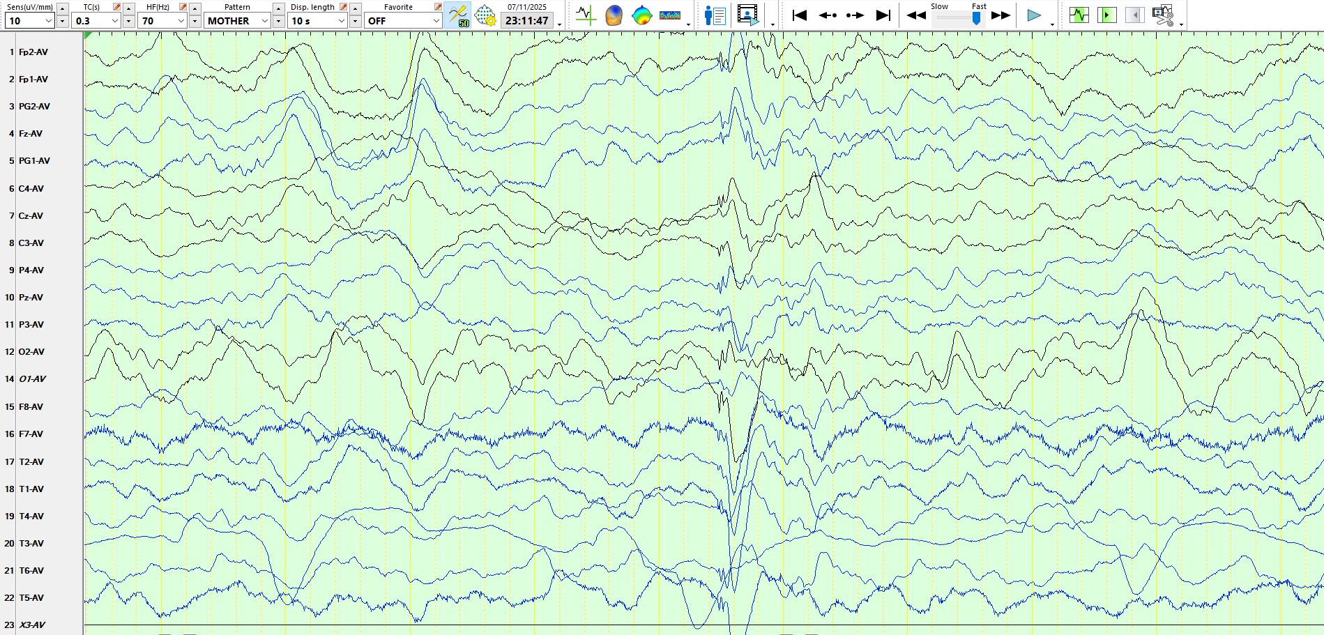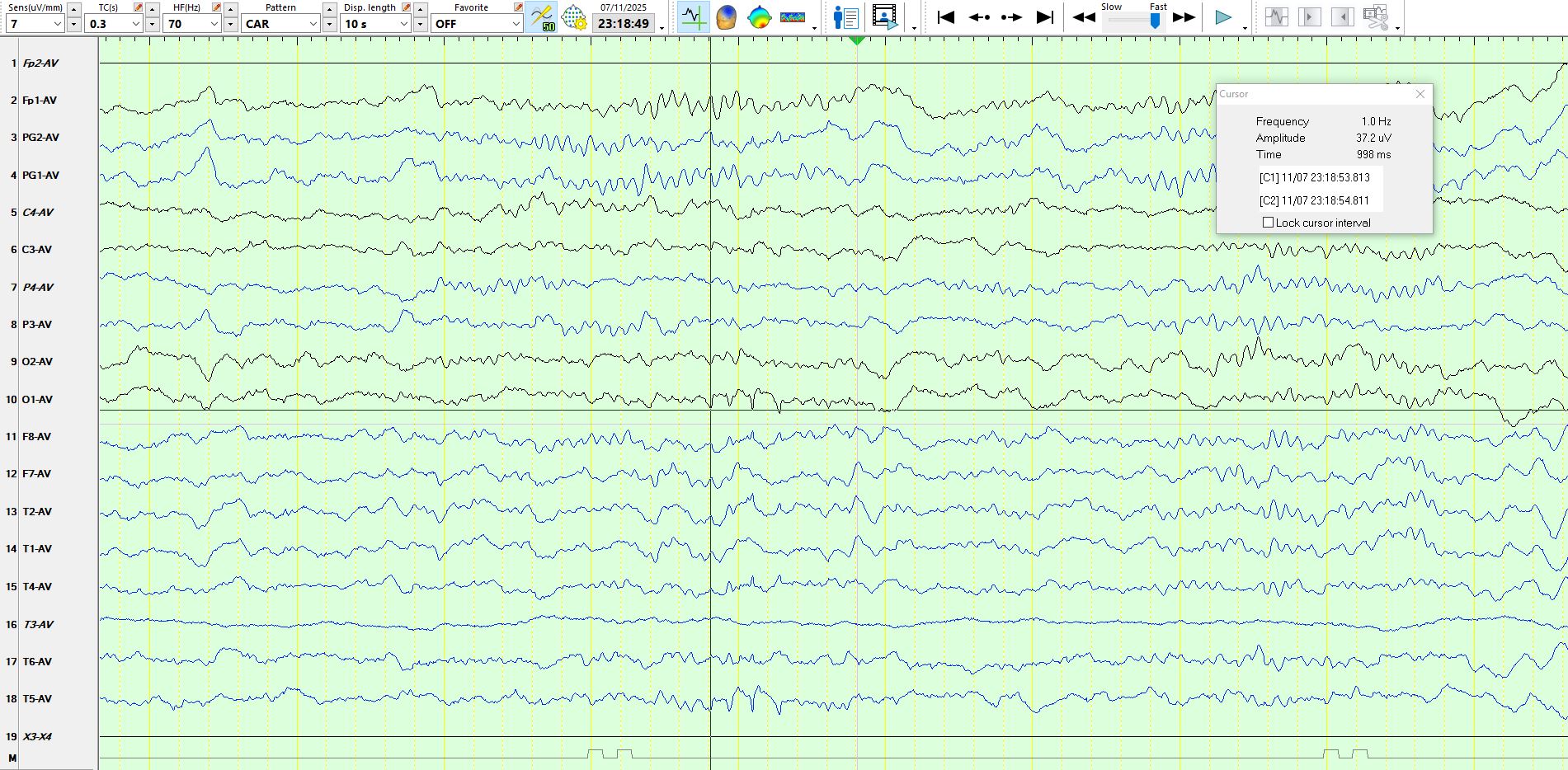 PPS: The two pages demonstrating the same epoch on bipolar montage are shown because it was clear to me, while looking at the top page, that there was a transposition of C3 and P3. Correction of this on the second page elegantly shows the vertex wave on the left-hand side of the page.