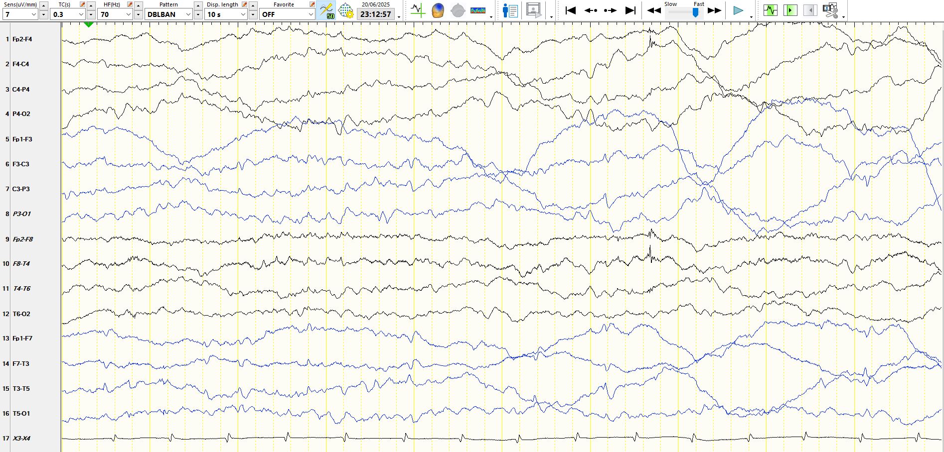 In the above, you will see that the discharges are very close to 6 Hz. On bipolar montages there are easily missed; see below, identifiable by the small red dots