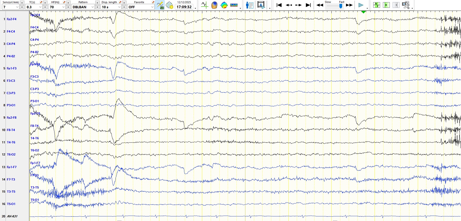 The answer? Neither of the above possibilities. This is a train of spikes, arguably representing a brief electrographic seizure, admittedly less than 10 seconds. There is evidence for the latter statement; the following is the onset of a clinical seizure, commencing with motor symptomatology in the LEFT foot: