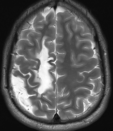 You should then ask the question, Why is the discharge best seen on the left? There are three possible explanations. First, there is a possible transposition of the relevant or even all right and left hemispheric derivations (by carefully analyzing the EEG with the video, especially at times of different artifacts, this possibility can be excluded). Second, perhaps the seizure discharge originated in the left medial central cortex, representing function for the right foot, with oblique propagation to the right central convexity. Third, perhaps there is structural damage to the cortex in the right parasagittal convexity, precluding expression of the seizure discharge from within the superior right frontal-central-parietal convexity. There are several reasons why the third possibility explains the apparent discordance between the EEG and the clinical manifestations. First, notice that the interictal EEG recording demonstrates relative suppression of background rhythms over the left central-periatal region. Second, the patient has a spastic hemiparesis of the left leg and, to a lesser extent, of the left hand and arm. Third, the MRI scan demonstrates evidence of cavitation (loss of cortex) within the superior aspect of the right frontal-central-parietal convexity, related to a haemorrhagic stroke that occurred at the age of seven years:
