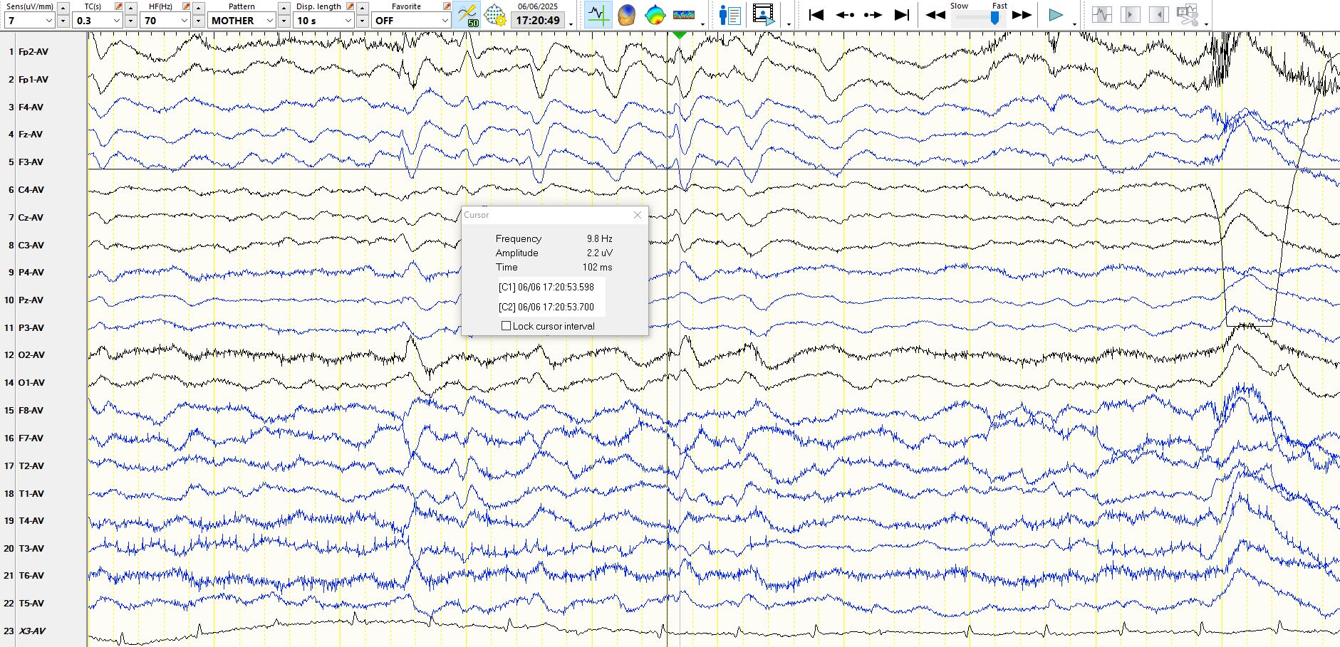 There is another wave on the EEG which corroborates the conclusion that the first wave in the first image above represents a spike at F3-FZ-FP1 (left superior frontal). Notice the short duration of the following wave and notice the shape of the aftercoming slow wave.